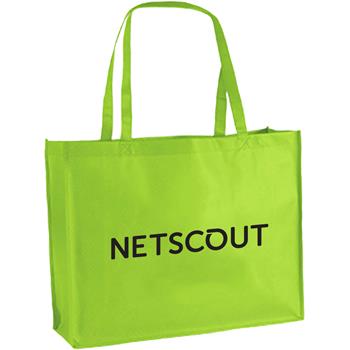 Premium non-woven polypropylene tote with stitched seams, side and bottom gussets, and 28" reinforced sewn handles.