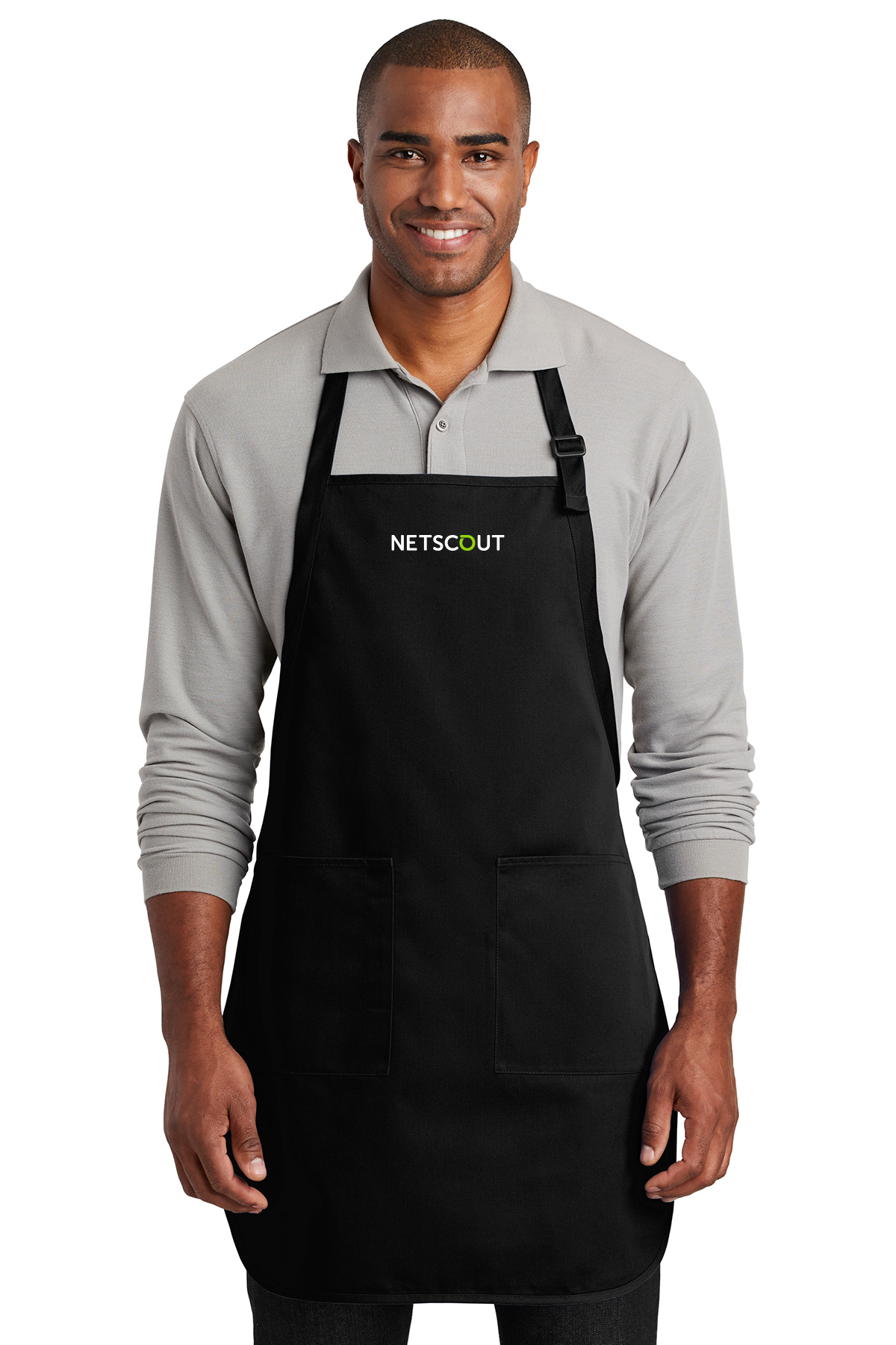 Black mid-length stain release apron with embroidered NETSCOUT logo on front pocket.